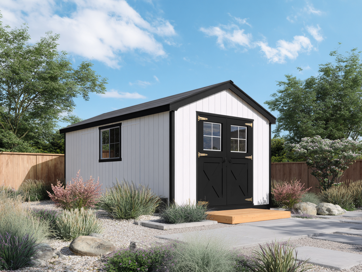 Caseta de jardín de madera 240x180x220 cm - madera - negro/blanco - para exterior - con puertas dobles y ventanas