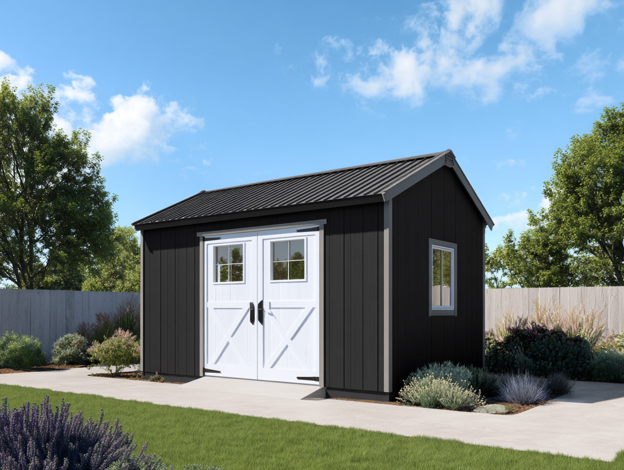 Fabricada en madera tratada con acabado exterior en color negro. Las puertas y los marcos de las ventanas presentan un acabado en color blanco que aporta contraste visual y una apariencia definida.