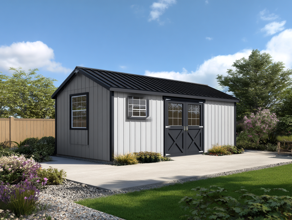 Estructura estable con puertas dobles frontales y ventanas integradas que permiten la entrada de luz natural. Diseño pensado para facilitar el acceso y el uso diario en el jardín.