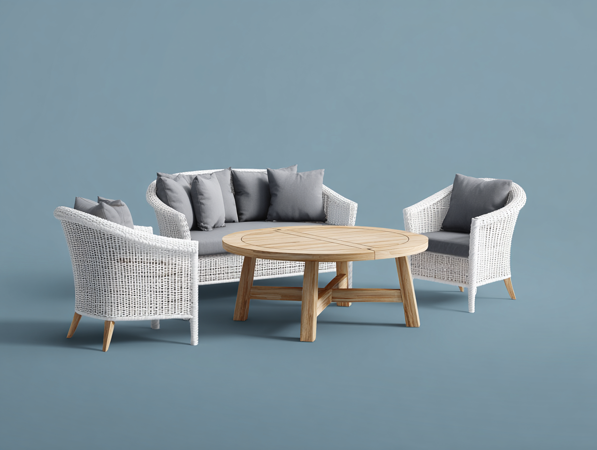 El armazón está fabricado en ratán sintético trenzado de color blanco, con propiedades resistentes a la humedad y a la intemperie, y se combina con cojines en tono gris. La mesa de centro cuenta con un tablero de madera maciza en tono natural tratado, que ofrece estabilidad y durabilidad.