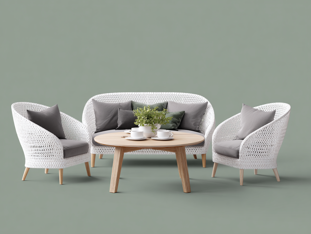 Este conjunto de sofá y sillones de jardín está diseñado para crear un espacio de descanso cómodo y funcional en exteriores como jardines y terrazas. La disposición equilibrada del sofá, los sillones y la mesa central permite un uso práctico para reuniones y momentos de relax al aire libre.
