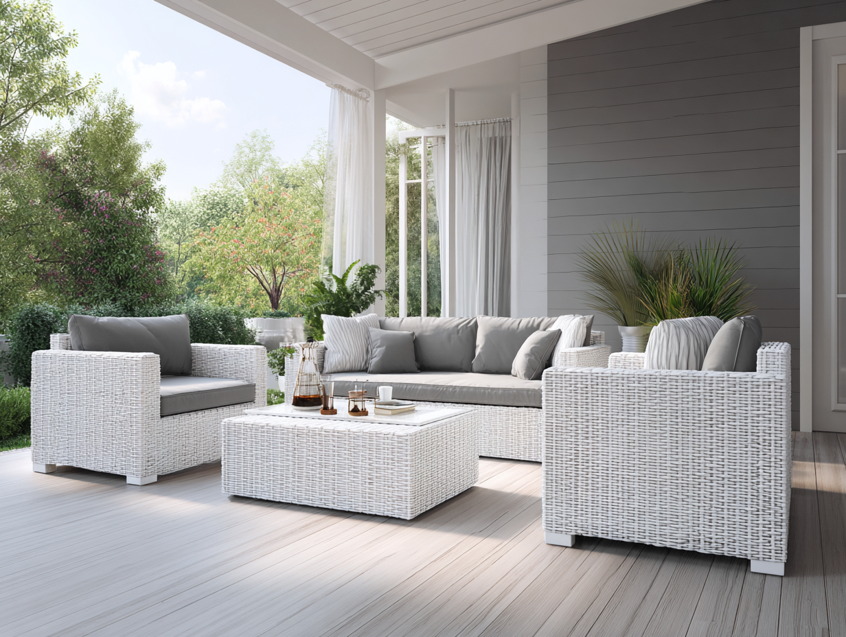 Estructura fabricada en ratán sintético trenzado en color blanco con acabado uniforme. Las superficies de asiento incorporan acolchado en color gris, adecuado para uso en exteriores.
